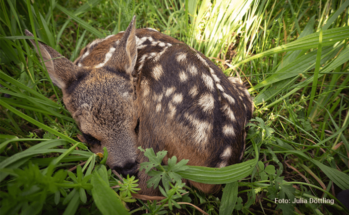 - Die gesicherten Kitze müssen spätestens 2,5 Stunden nach der Mahd wieder freigelassen werden. Dabei ist darauf zu achten, dass die Rehgaisen ihre Kitze wieder annehmen. Eventuell muss die Gais mit dem „Kitzfiep“ gelockt werden.